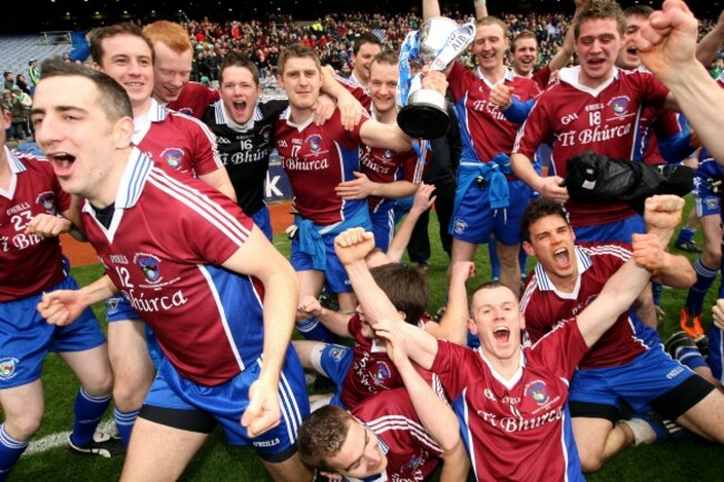 The crowd at Cusack Park might have been expecting a hard-fought encounter between these two local rivals but the in-form play of Meath’s forward lines resulted in a surprisingly facile win for the Royals. Cian Ward and Stephen Bray got their team off the mark early and Westmeath, simply, had no answers to the questions asked of them. Defender Michael Ennis saw red for a second yellow card on 53 minutes and there was even time for a late appearance from Graham Geraghty, though he was denied a goal because of a wonderful save from Gary Connaughton. St. Patrick’s celebrate their All-Ireland Junior Club Championship final win over Derrytresk at Croke Park. INPHO/Ryan Byrne.