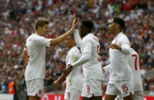 Welbeck is congratulated by Gerrard (left) and Lescott. Tim Hales/AP/Press Association Images