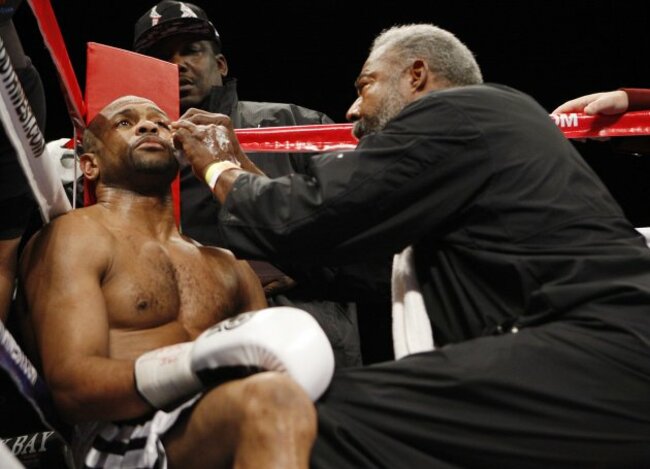 Roy Jones Jr gets a cut treated during his 2010 bout with Bernard Hopkins. (AP Photo/Isaac Brekken)