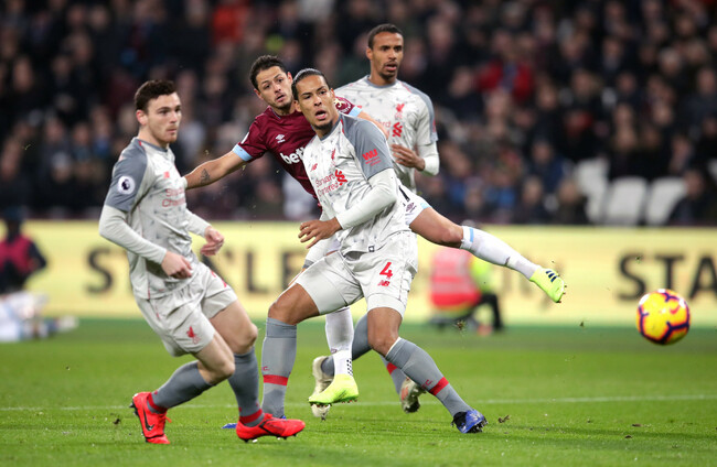 A free-kick into the box at the other end is cleared to the edge of the area. Mark Noble sets himself up to have a go from range, but his left-footed strike is blocked down and hoofed clear by Virgil Van Dijk.