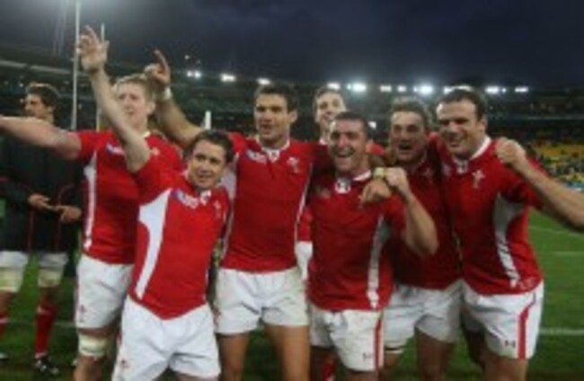Bradley Davies Shane Williams Mike Philips George North Huw Bennett Jonathan Davies and Jamie Roberts celebrate in 2011. ©INPHO/Billy Stickland