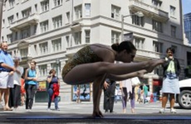 Thayne Dibble, an instructor with Bikram Yoga demonstrates yoga poses as people look on a corner of Rittenhouse Square. Alex Brandon