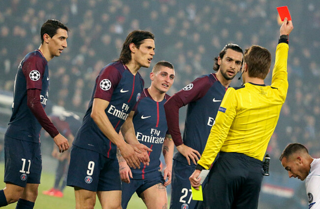 Marco Verratti of PSG receives a red card and is sent off by referee Felix Brych of Germany while Angel Di Maria, Edinson Cavani and Javier Pastore protest.