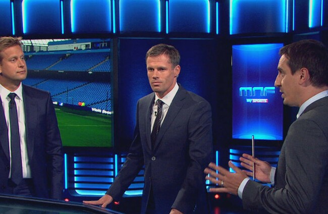 Jamie Carragher and Gary Neville with Ed Chamberlan on Sky's Monday Night Football.