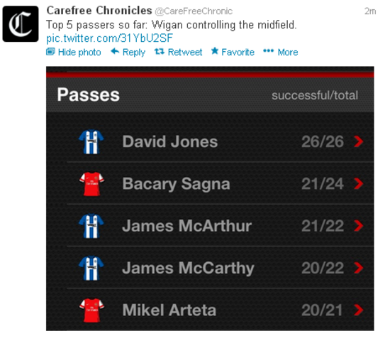 Well that was bizarre. Referee Jon Moss signals for Di Santo to leave the field for a reason unknown to the player and a furious Roberto Martinez. The Argentine player spends a couple of minutes looking baffled on the sidelines while Arsenal attack against ten men. Finally he’s allowed to return. Was he sinbinned?