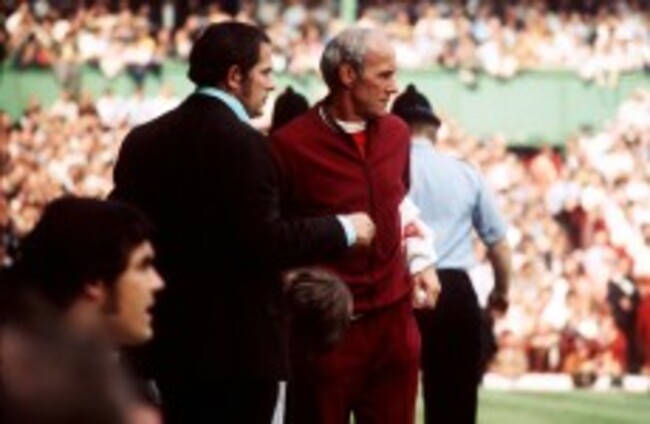 Manchester United manager Wilf McGuinness takes a deep breath on the bench as trainer Jack Crompton applauds a good move. EMPICS Sport
