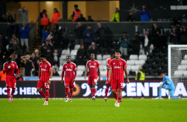 SWANSEA SCORED twice in stoppage time to complete a stunning comeback and knock Premier League side Nottingham Forest out of the Carabao Cup with a 3-2 win in Wales.