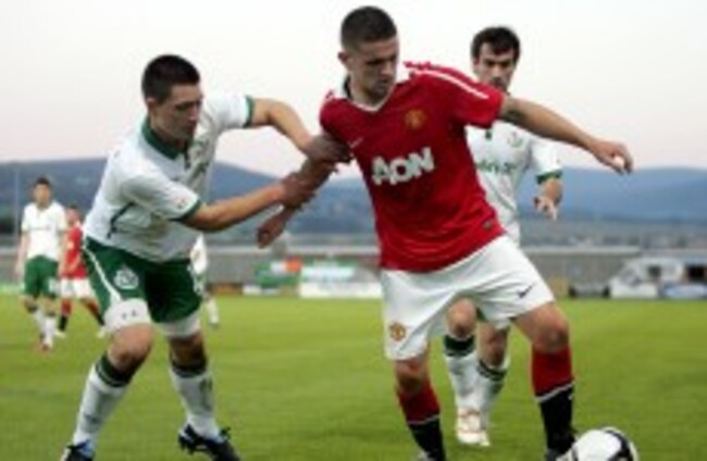 Manchester United's Robert Brady holds off the challenge of Shamrock Rovers' Darren Murray last summer. INPHO/Ryan Byrne