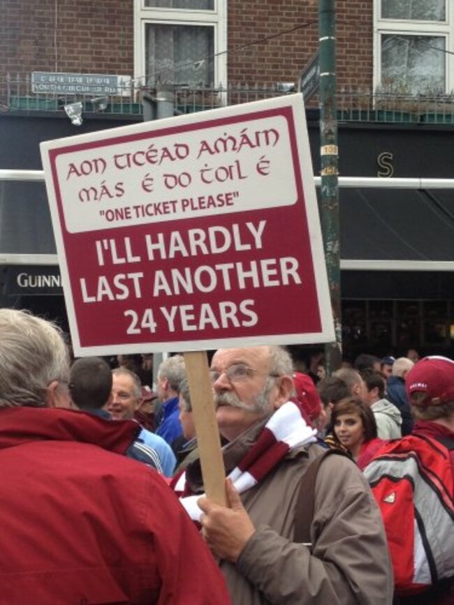Our colleague in TheJournal, Gavan Reilly sent us this snap — taken in the past hour outside Gill’s on the North Circular Rd – of one Galway man’s plea for an All-Ireland hurling final ticket?