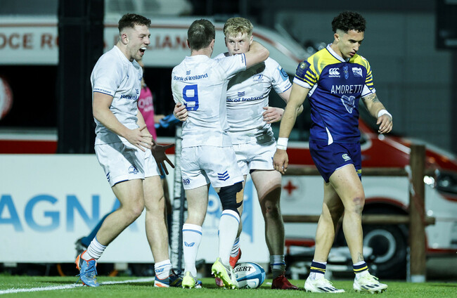 Half-backs Fintan Gunne and Sam Prendergast were introduced ahead of the next play. They didn’t get much of an opportunity to leave their own imprints on the game as Leinster absorbed Zebre pressure throughout the final quarter, but Gunne did zip a skip pass out to John McKee who fed Rob Russell for the right wing’s second try, and Leinster’s fifth, as the eastern province put the cherry on top.
